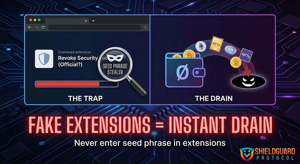 - The Drain: Instead of “revoking” permissions, the extension asks for your seed phrase to “scan for vulnerabilities.”
